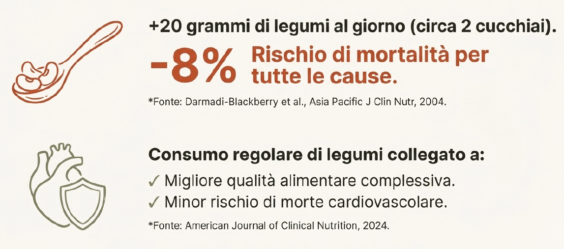 Una meta-analisi pubblicata nel 2023 su Nutrients ha confermato il trend: chi consuma più legumi vive più a lungo e ha un rischio inferiore di mortalità per tutte le cause.