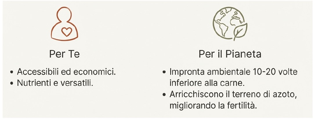 In più, hanno un’impronta ambientale 10-20 volte inferiore rispetto alla carne bovina, e arricchiscono il terreno di azoto, migliorandone la fertilità.