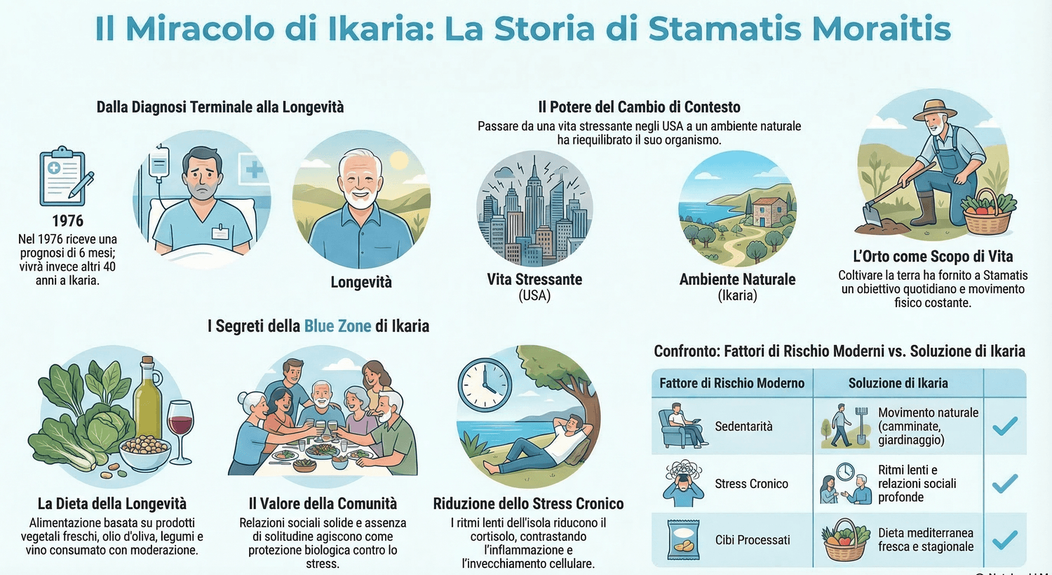 Quando Moraitis tornò sull’isola nel 1976, quindi, non tornò semplicemente in un luogo della sua infanzia. Tornò in un ambiente che oggi la scienza considera particolarmente favorevole alla longevità.