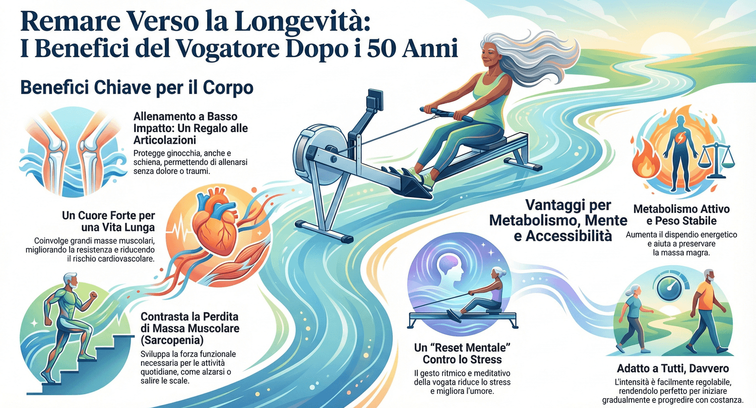 Ed è qui che il vogatore diventa particolarmente interessante dopo i 50 anni: quando il corpo cambia, quando le articolazioni chiedono rispetto e quando non possiamo più permetterci allenamenti caotici o ad alto impatto.