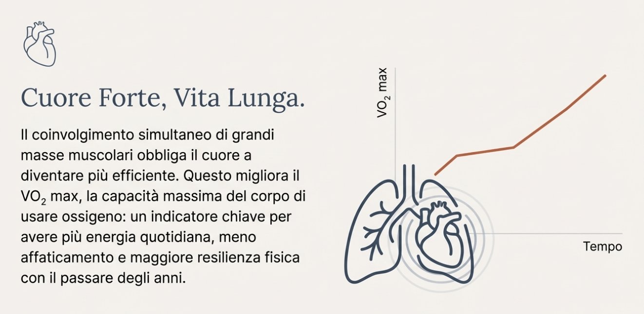 Il vogatore è uno strumento straordinario da questo punto di vista perché coinvolge grandi masse muscolari in modo simultaneo. Questo obbliga cuore e polmoni a lavorare in modo coordinato, migliorando la capacità di trasportare ossigeno ai tessuti.
